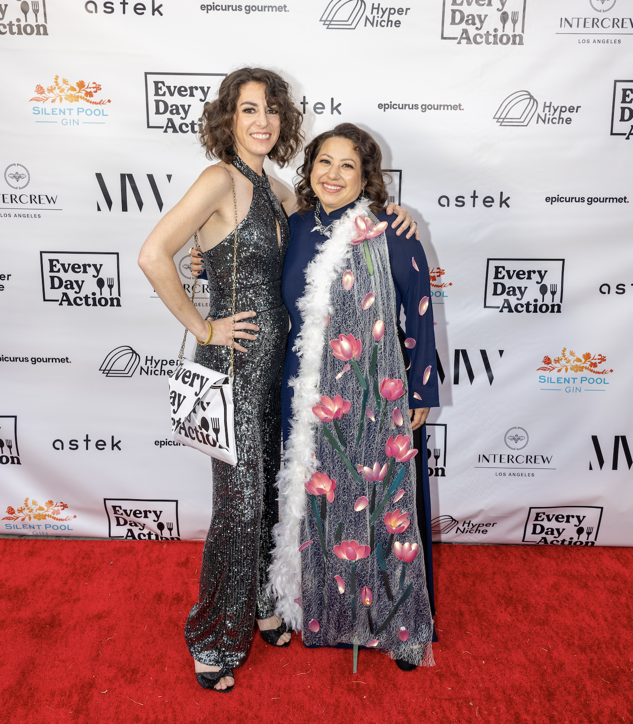 Co-founder Sam Luu made her flower sash entirely from recycled materials including cutlery and co-founder Hillary Cohen’s outfit was vintage with a purse she made from 2024's step and repeat