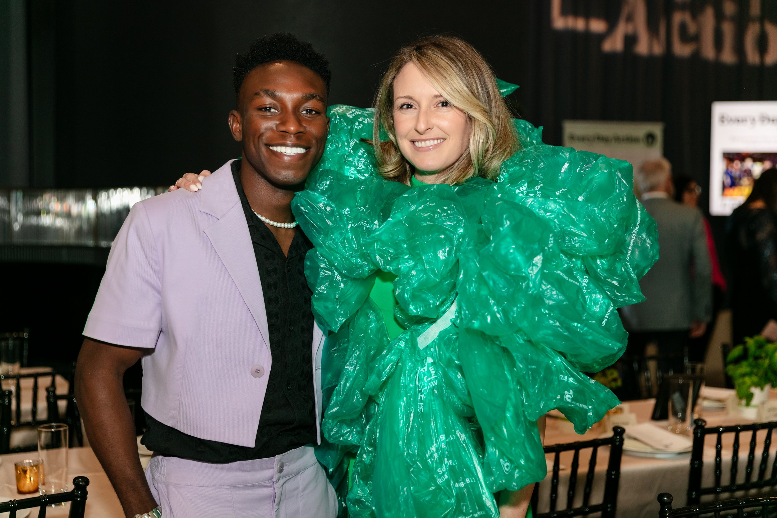 Board member Alix Foedisch made her outfit entirely out of recyclable dog waste bags.